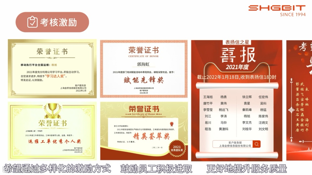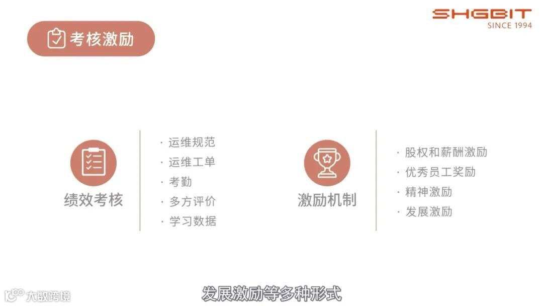 我们的绩效考核包含了“运维规范、运维工单、考勤、多方评价、学习数据”等多个维度,以便全面了解与评估员工的工作状态,挖掘问题、促进成长。而考核后的激励机制,更是包含了“股权和薪酬激励、优秀员工奖励以及精神激励、发展激励”等多种形式,希望通过多样化的激励方式,鼓励员工积极进取、更好地提升服务质量。