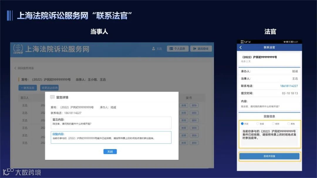 所以,如果你不能马上通过电话联系到法官,也不用着急,通过“12368诉讼服务平台”和在线“联系法官”模块,就会有人工和技术,帮你把问题和需求传达到法官,法官会在规定时间内处理并给你答复。