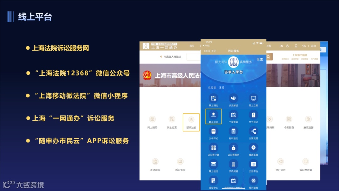 联系法官有很多方法,除了刚刚介绍的12368诉讼服务热线,上海法院专门开设了线上“联系法官”模块,在“上海法院诉讼服务网”、“上海法院12368”微信公众号、“人民法院在线服务上海”微信小程序、 上海“一网通办”诉讼服务和“随申办市民云”APP诉讼服务等平台都能找到这个模块。