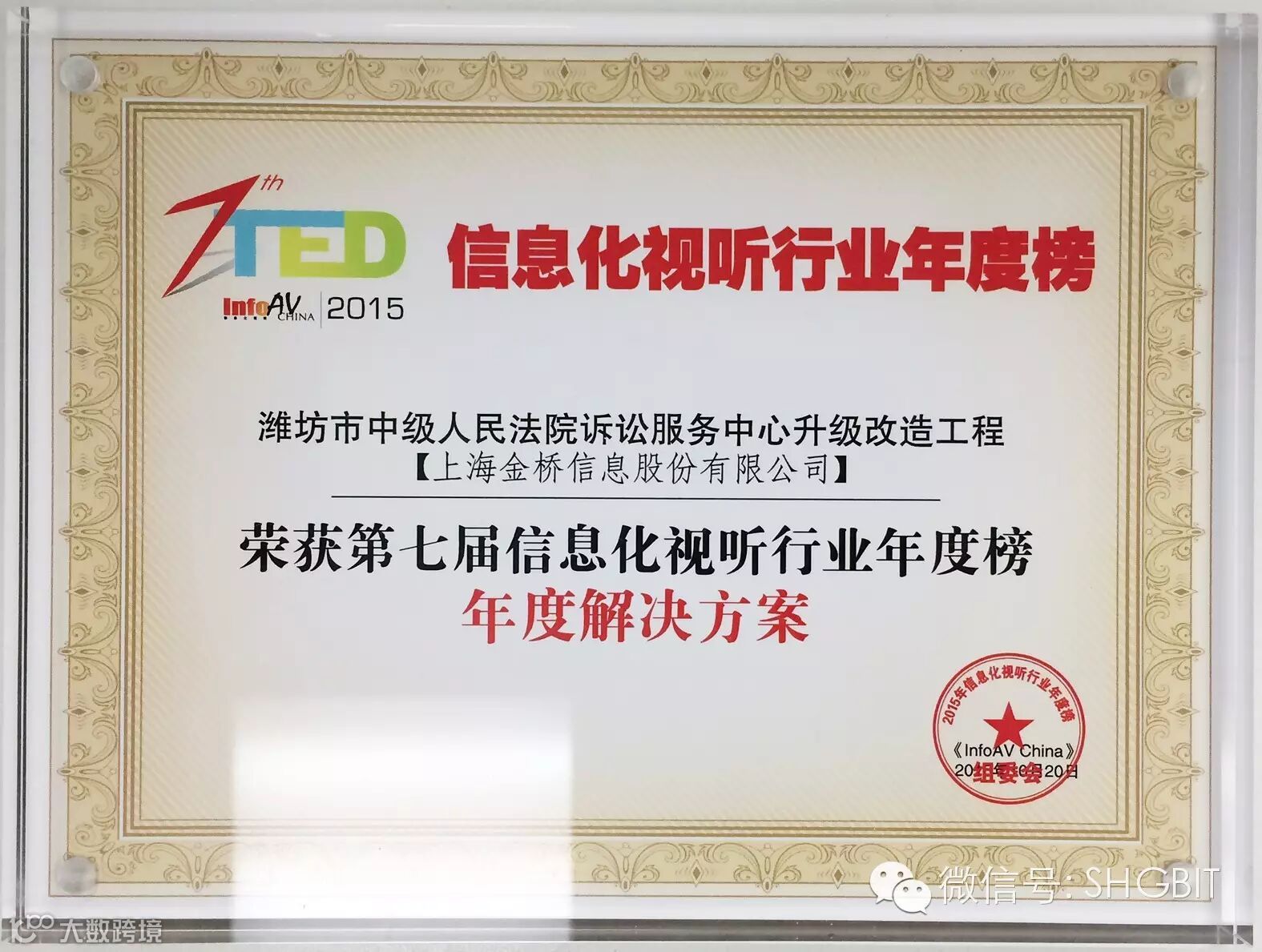 由依马狮传媒及旗下行业媒体《InfoAV China》举办的“2015(第七届)信息化视听行业高峰论坛暨行业年度榜单发布盛典”活动于2015年10月20日在北京乙十六盛大召开。在本届行业年度评选中,上海金桥信息乃众望所归,在斩获“第七届信息化视听行业年度代理商/集成商”称号后,又一举荣登“第七届信息化视听行业年度解决方案”榜!