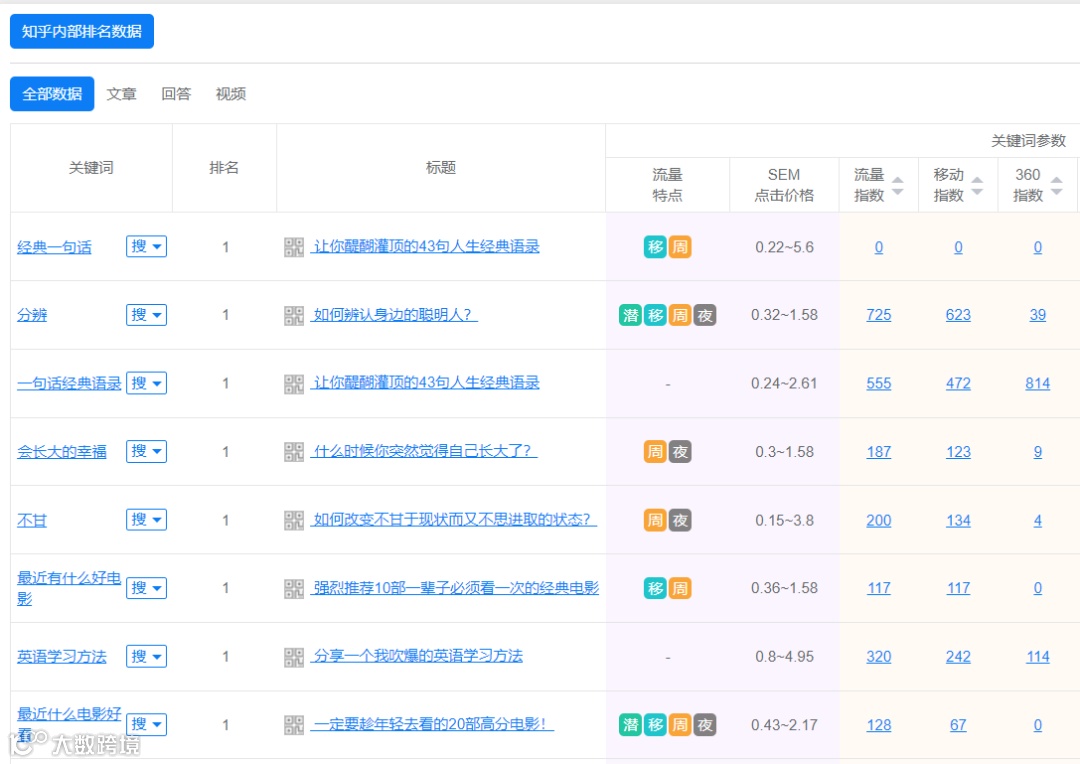 5、做好数据分析跟进,每日查看自己的排名情况及权重,对自己的内容选题、布局等情况进行评估,对已有排名流量的回答、文章、视频做分析,便于继续效仿。