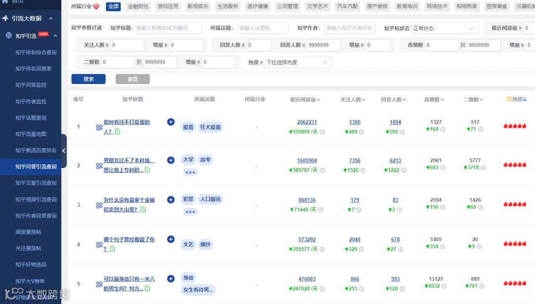 通过工具找出流量巨大的主流搜索引擎中,知乎的排名数据,借助大数据的筛选过滤,挖掘出关注量大,但回答量少的蓝海问题。