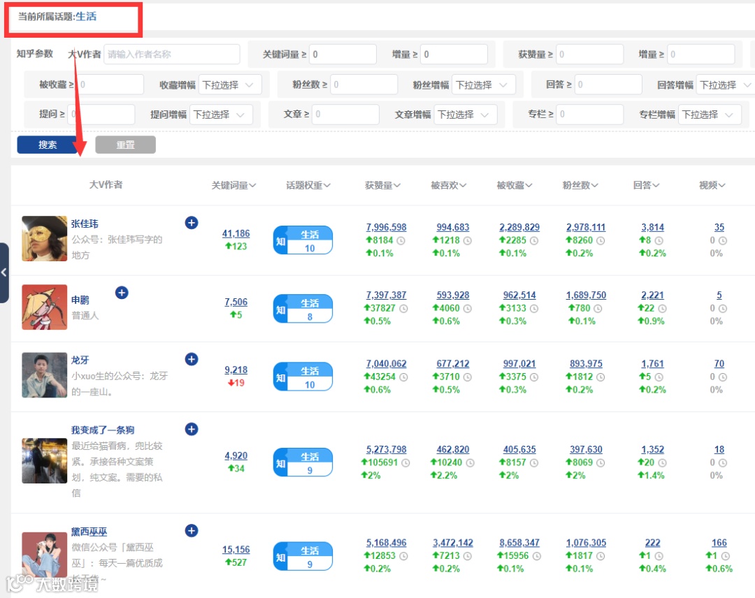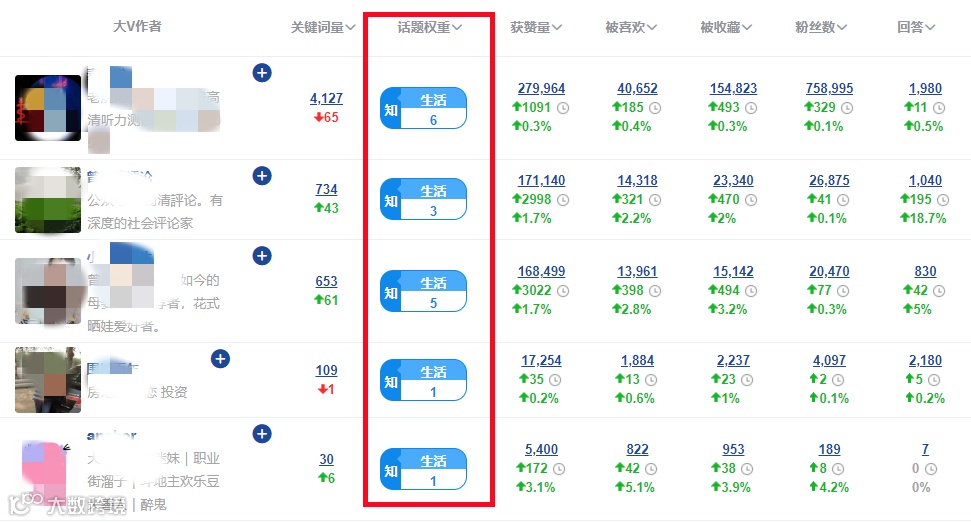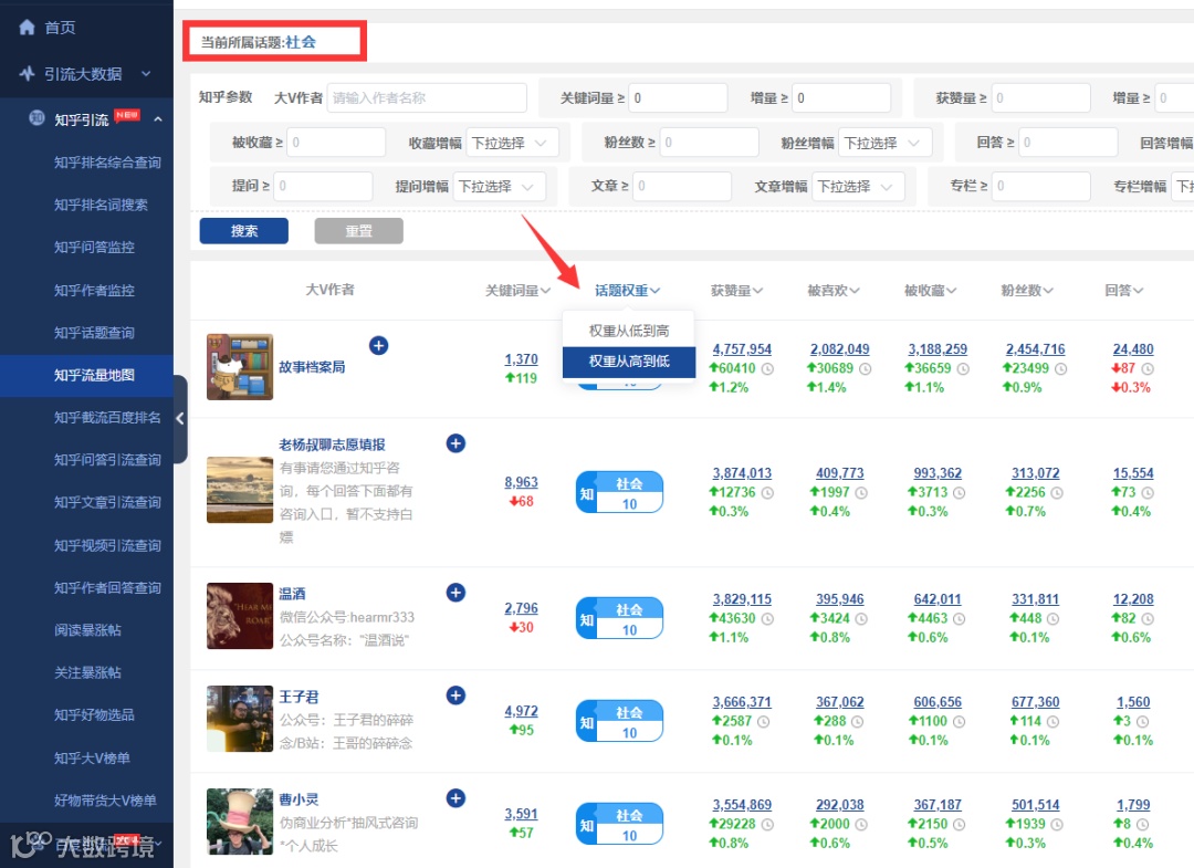 1、根据参与话题筛选,数据列将显示作者在话题下的权重,用作找出某领域内最强作者。