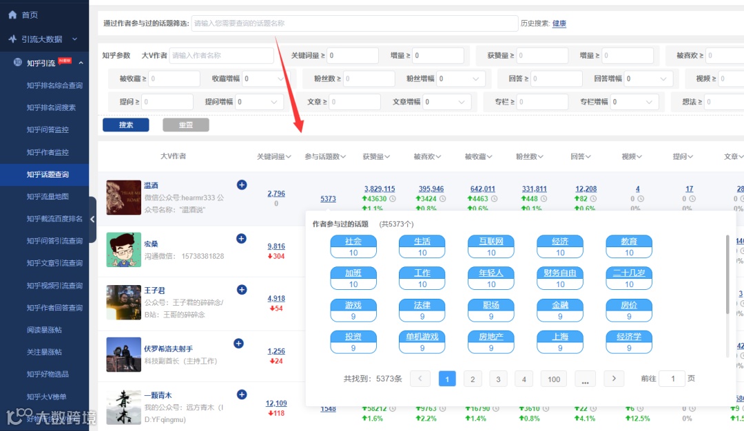 2、如不做话题筛选,数据列将显示作者参与过的所有话题,用作查看某个作者参与的所有话题中最强话题。
