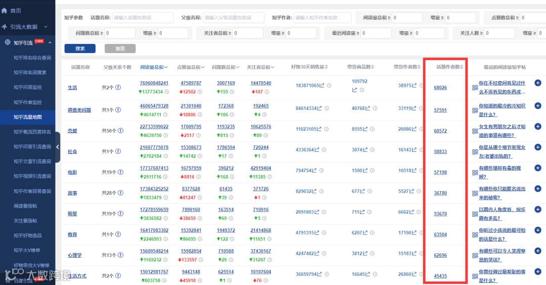 在5118「知乎流量地图」筛选项及参数列中,新增了“话题作者数”,用于区别该话题下的作者权重。