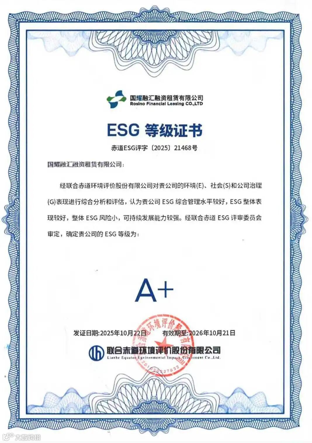 近日,第三方评估机构联合赤道环境评价股份有限公司(以下简称“联合赤道”) 针对国耀融汇租赁2024年在ESG方面的切实举措和公开信息,出具ESG评级证书。国耀融汇租赁本次ESG评级为A+,这也是国耀融汇租赁连续第三年获评A级,标志着公司在推进ESG管理方面进入新阶段,步入同业领先水平。