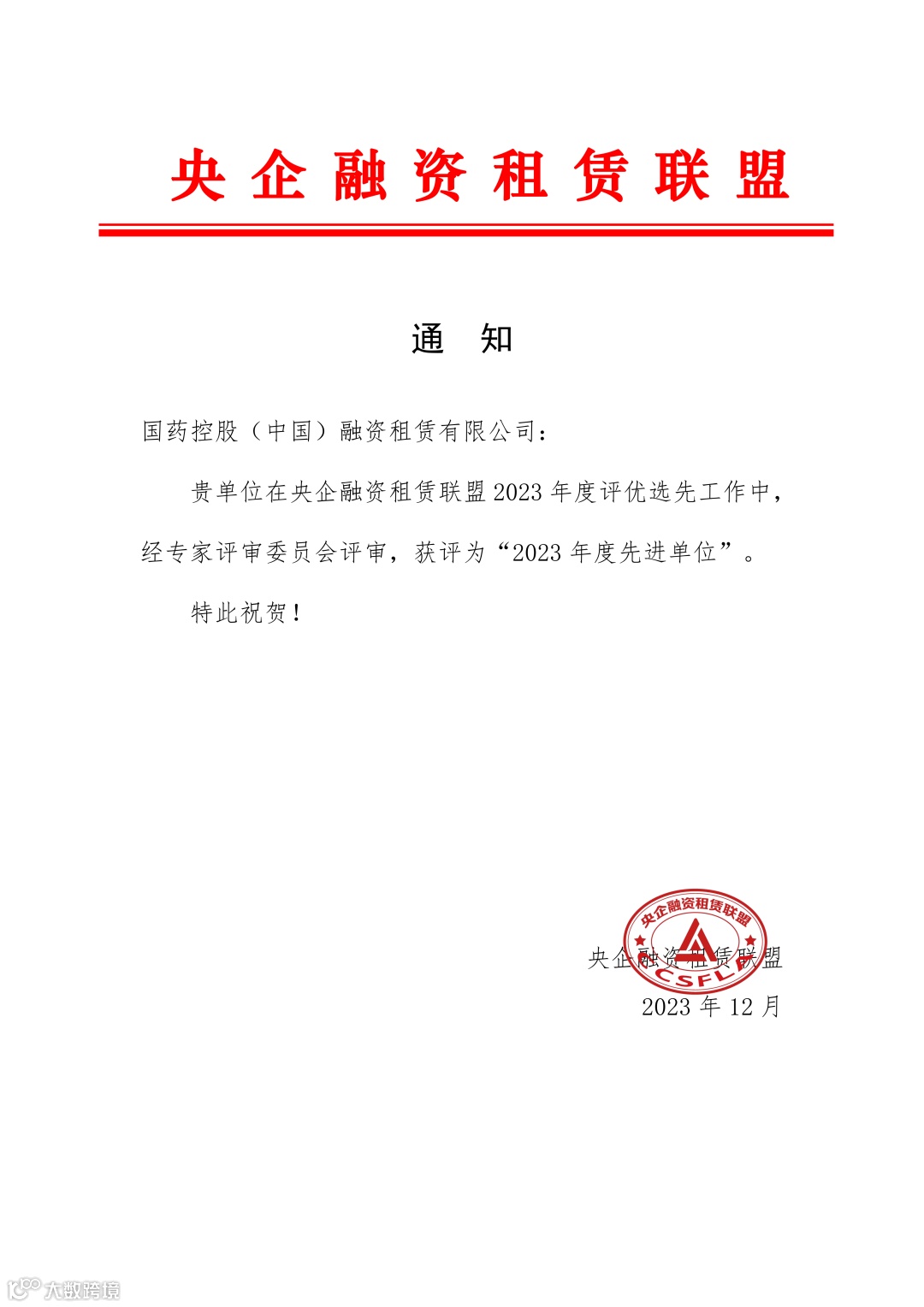 近日,央企融资租赁联盟组织开展的“2023年度评优选先”结果公布。经过联盟专家、学者的一致评定,国控租赁凭借在“落实国家战略、服务实体经济”、“服务央企主责主业”、“公司党建”、“风险合规管理”、“业务创新发展”等方向的优秀做法和业绩成效荣获“2023年度先进单位”。