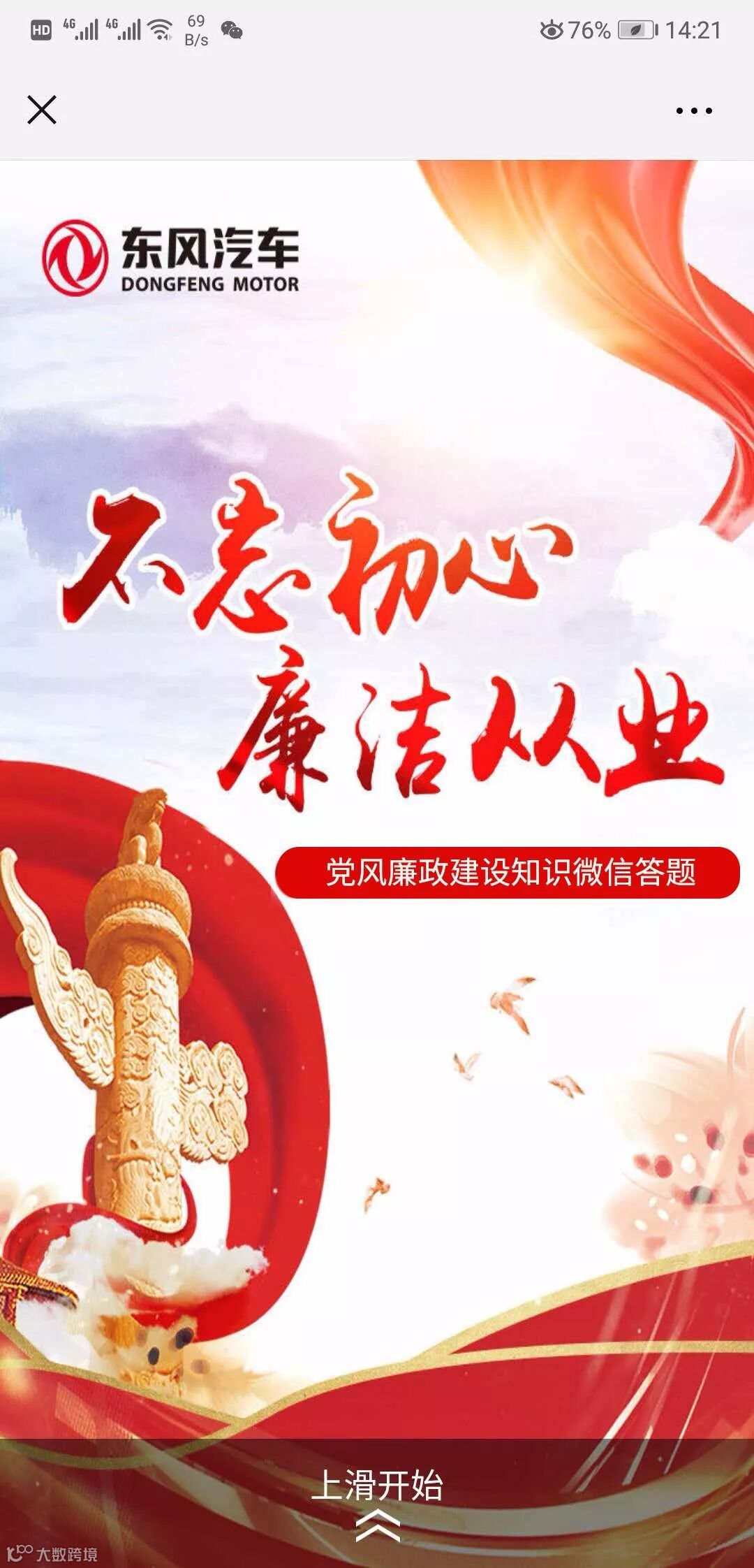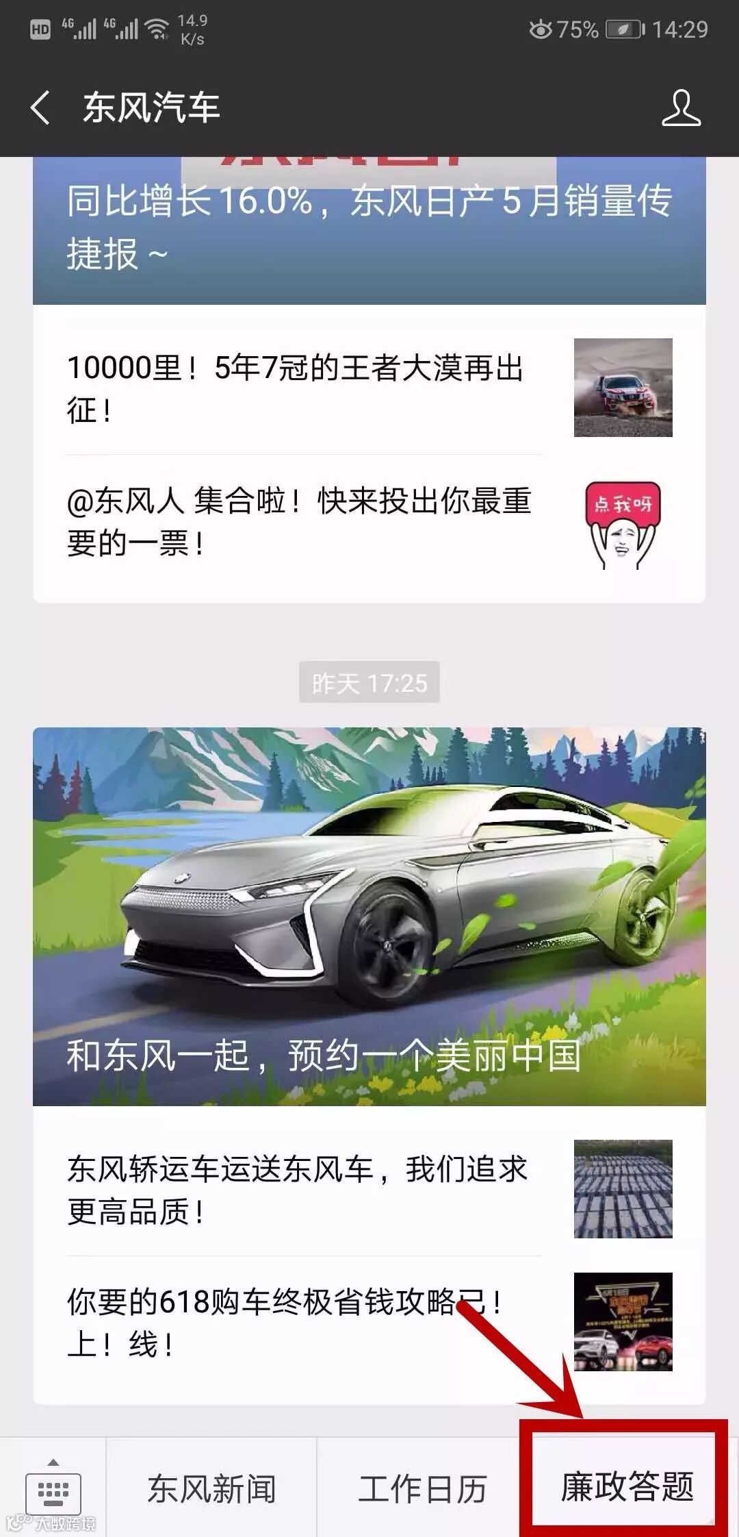 第一步:关注“东风汽车”微信公众号,点击自定义菜单“廉政答题”