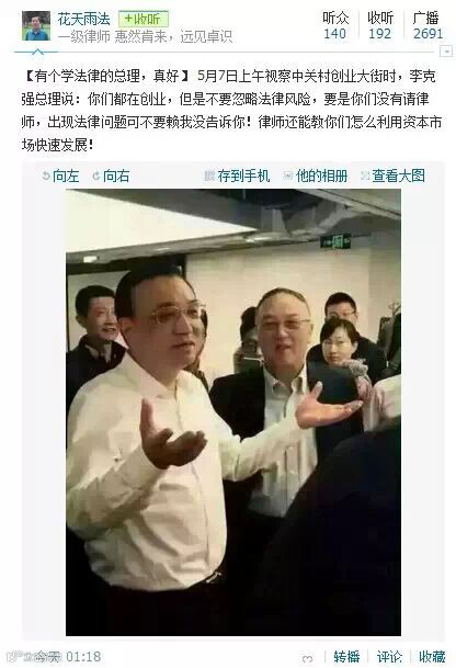 5月7日上午视察中关村创业大街时,总理说:你们都在创业,但是不要忽略法律风险,要是你们没有请律师,出现法律问题可不要赖我没告诉你!律师还能教你们怎么利用资本市场快速发展!!