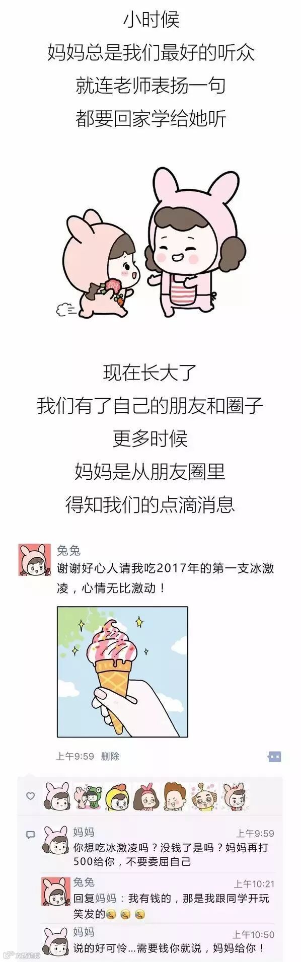 “从小觉得最厉害的人就是妈妈,不怕黑,什么都知道,做好吃的饭,把生活打理得井井有条,哭着不知道怎么办时只好找她。可我好像忘了这个被我依靠的人也曾是个小姑娘,怕黑也掉眼泪,笨手笨脚会被针扎到手。最美的姑娘,是什么让你变得这么强大呢,是岁月,还是爱。”