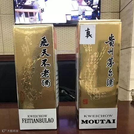 庭上,茅台公司对飞天不老酒和飞天茅台酒进行现场勘验。“茅台酒和不老酒比对,不老酒装潢中左侧的图案是一个单手托酒杯的飞天仙女图案,头朝下,旁边印有是飞天不老酒的字样;与茅台酒相似的地方是左侧飞天仕女基本一致,包括裙摆朝向等。飞天不老酒汉字中,飞天是繁体的飞天,其读音与572号商标相同,只是把简体变为繁体。”