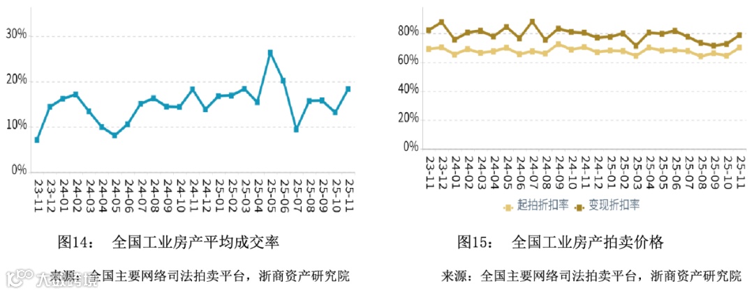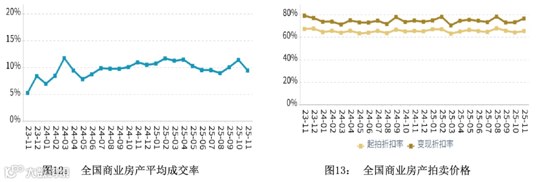 在成交率方面,2025年11月全国商业平均成交率环比微幅下降,平均水平低于同期。在拍卖价格方面,2025年11月全国商业平均变现折扣率环比微幅上升,平均水平高于同期。变现价相对于起拍价的溢价幅度相比于同期有所扩大。