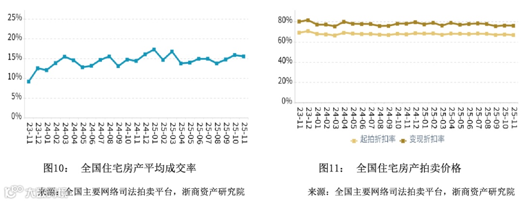 2025年11月全国住宅平均成交率环比微幅下降,平均水平高于同期。在拍卖价格方面,2025年11月全国住宅平均变现折扣率环比微幅下降,平均水平低于同期。变现价相对于起拍价的溢价幅度相比于同期有所收窄。