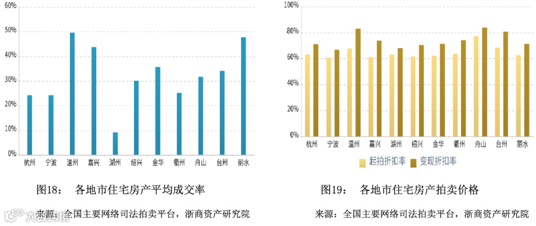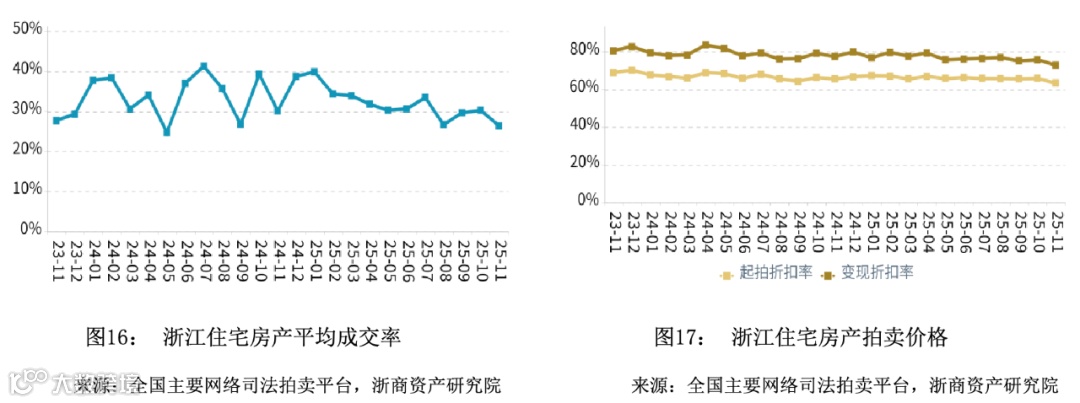 在成交率方面,2025年11月浙江住宅平均成交率环比微幅下降,平均水平低于同期。温州市成交率领先,湖州市成交率最低。在拍卖价格方面,2025年11月浙江住宅平均变现折扣率环比微幅下降,平均水平低于同期。变现价相对于起拍价的溢价幅度相比于同期有所收窄。