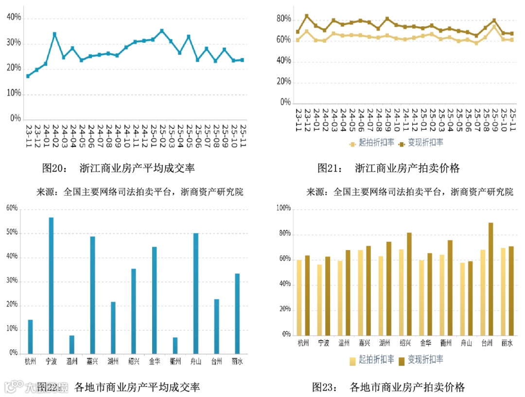 在成交率方面,2025年11月浙江商业平均成交率环比微幅上升,平均水平低于同期。宁波市成交率领先,衢州市成交率最低。在拍卖价格方面,2025年11月浙江商业平均变现折扣率环比微幅下降,平均水平低于同期。变现价相对于起拍价的溢价幅度相比于同期有所收窄。