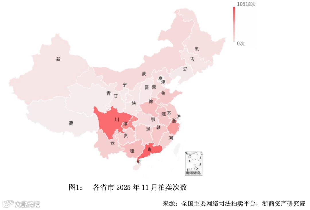 2025年11月全国司法拍卖房产共计100559次,同比下降11.17%。区域上,以广东、四川省为首的黄河以南的省市司法拍卖市场较为活跃,前三位分别是广东省、四川省、重庆市。