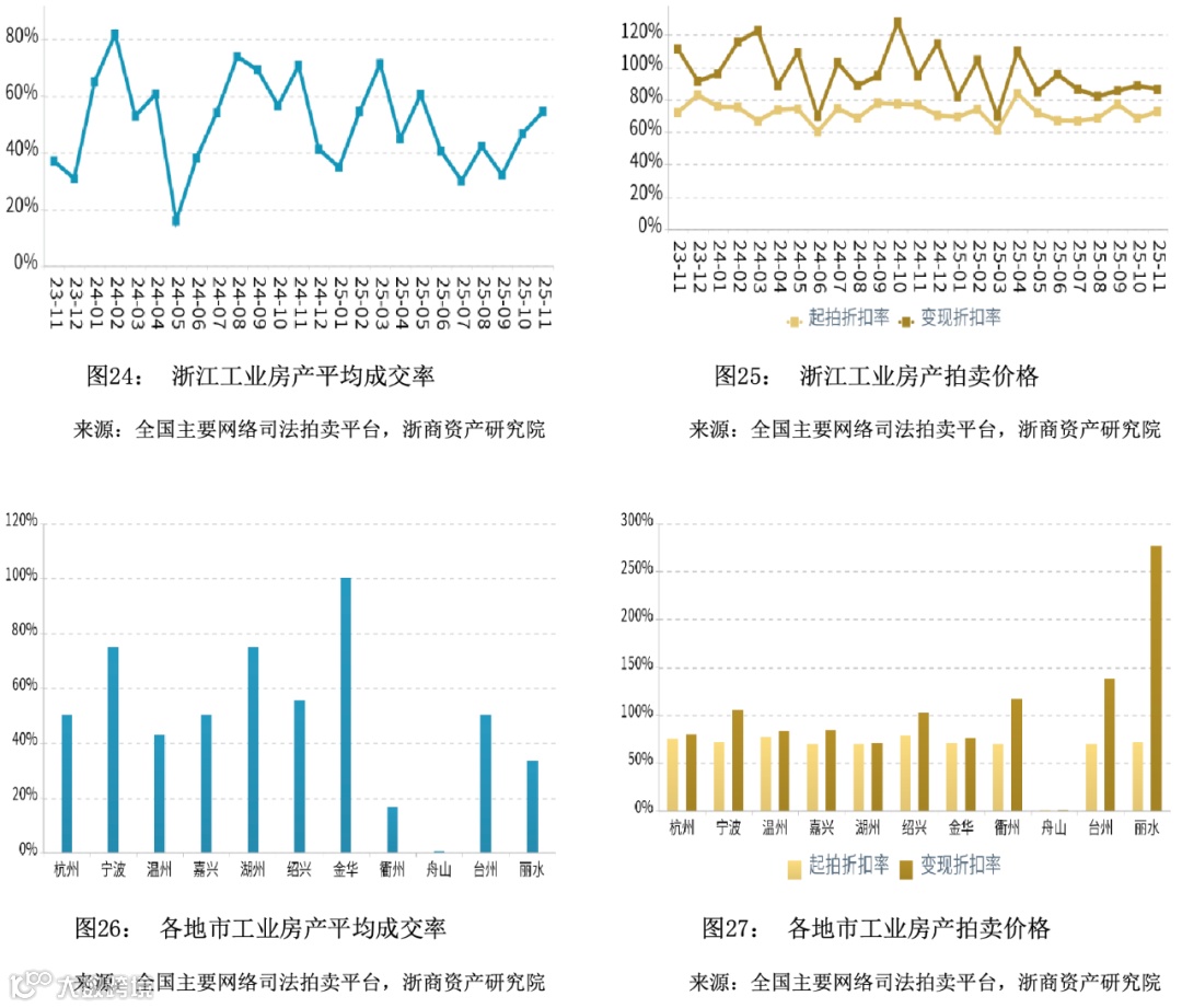 在成交率方面,2025年11月浙江工业平均成交率环比大幅上升,平均水平低于同期。金华市成交率领先,舟山市没有成交记录。在拍卖价格方面,2025年11月浙江工业平均变现折扣率环比微幅下降,平均水平低于同期。变现价相对于起拍价的溢价幅度相比于同期有所收窄。