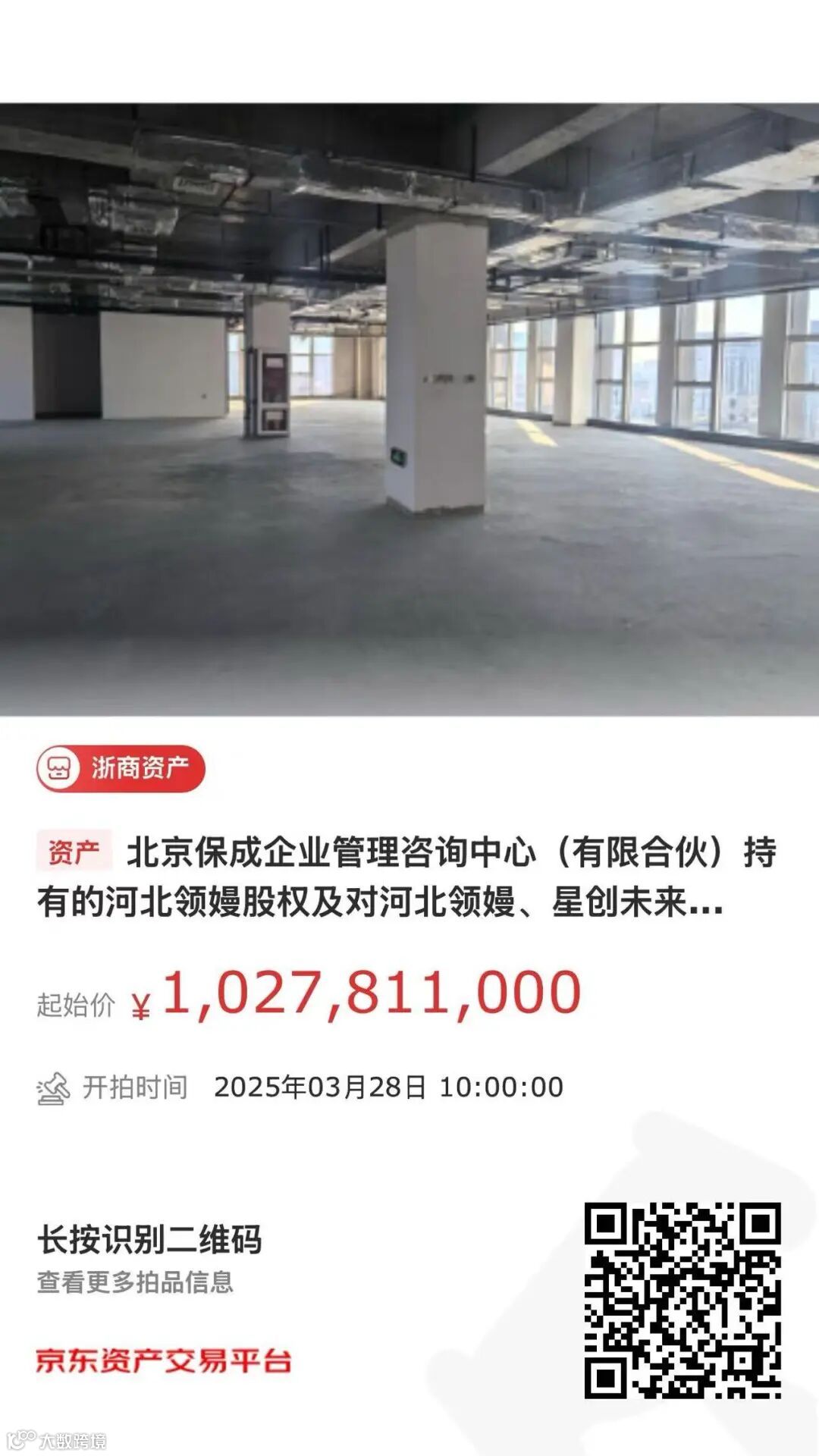 北京保成企业管理咨询中心(有限合伙)将委托浙江省浙商资产管理股份有限公司于2025年3月28日10时至2025年3月29日10时止(延时的除外)在浙江省浙商资产管理股份有限公司京东网资产竞价网络平台(https://auction.jd.com/paimaiShops.html?verdorId=10154782)开展对北京保成企业管理咨询中心(有限合伙)名下资产进行公开竞价活动,可识别下图查看详情。