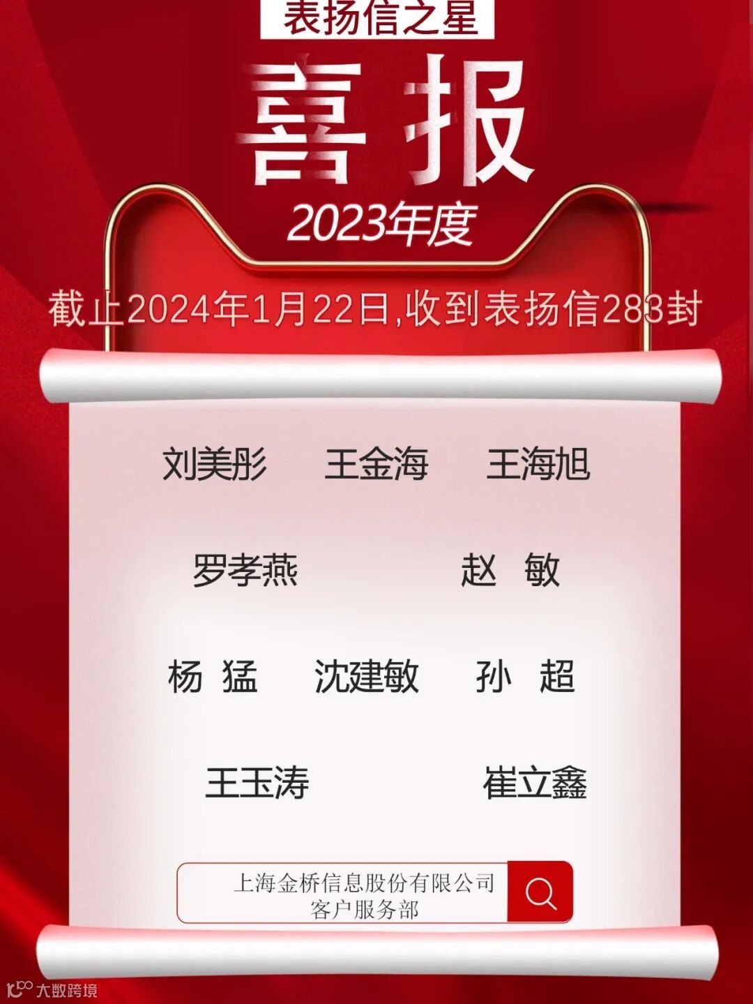 年关将至,两会也顺利闭幕了。我们文能提笔内外宣、武能上马保两会的“御前侍卫”们终于可以短暂地歇歇啦!就在刚刚,“金桥信息2023全国运维服务云颁奖”在云端火热进行,让我们看看都有哪些优秀的“侍卫们”收获了满满的赞誉和好运吧!