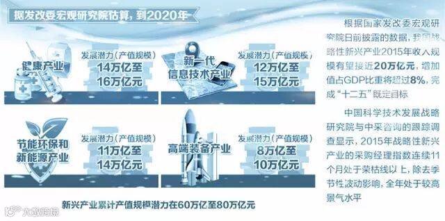 据发改委宏观研究院估算,到2020年,我国健康产业(包括生物医药、医疗器械和健康服务业)发展潜力(产值规模)将达到14万亿至16万亿元,节能环保和新能源产业为11万亿至14万亿元,新一代信息技术产业为12万亿至15万亿元,高端装备产业为8万亿至10万亿元,新型金融、新材料、现代物流、教育培训、绿色农业等也具有较大发展潜力,新兴产业累计产值规模潜力在60万亿至80万亿元。