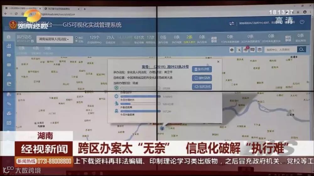 《法院信息化蓝皮书》指出,湖南法院高度重视信息化与执行工作的深度融合,大力探索执行信息化应用,率先在全省三级法院全面部署应用“执行指挥应急调度服务平台”,将执行办案、执行管理、执行联动、执行公开等各项工作统一纳入平台,打通内网外数据交互,实现内外互联互通,既提升了执行效率,也提高了执行规范化水平,为执行工作统一管理、统一指挥、统一协调提供了有效支撑,促进执行工作长效机制建设。截至2019年9月28日,湖南共注册开通移动执行账号3137个,执行干警上线326163人次,三级法院通过GIS可视化指挥管理系统连线7730次,上报处置突发事件322件,数十次跨省或与最高人民法院执行指挥中心进行视频会商、执行联动。