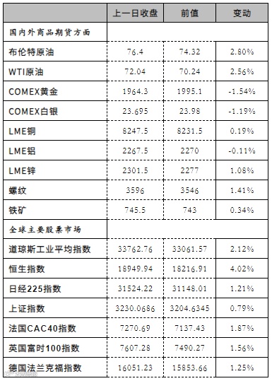 5.市场情况:Brent主力收于76.11美元/桶,前收74.28美元/桶,WTI主力71.74美元/桶,前收70.1美元/桶。Oman主力收于74.01美元/桶,前收73.85美元/桶,SC主力收于524.1元/桶,前收513元/桶。