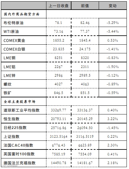 5.市场情况:Brent主力收于77.84美元/桶,前收82.1美元/桶,WTI主力72.84美元/桶,前收76.93美元/桶。Oman主力收于74.56美元/桶,前收78.95美元/桶,SC主力收于520.3元/桶,前收553元/桶。
