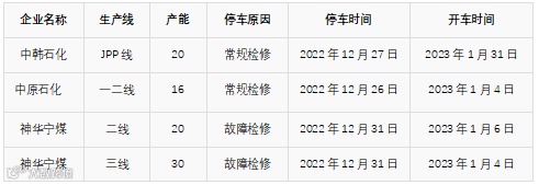 装置方面:江油万利年产15万吨天然气制甲醇项目于12月初因限气停车,预计春节后开;山西晋煤天源年产10万吨甲醇装置因疫情影响于11月24日停车,目前于12月28日重启;山西晋丰闻喜年产5万吨小装置目前运行平稳;高平年产10万吨甲醇装置1月2日停车;云南云天化年产26万吨甲醇装置因成本问题于1月1日停车,预计为期2个月以上。新疆新业年产50万吨甲醇装置目前临时检修,维持在半负荷运行状态,预计为期十天。