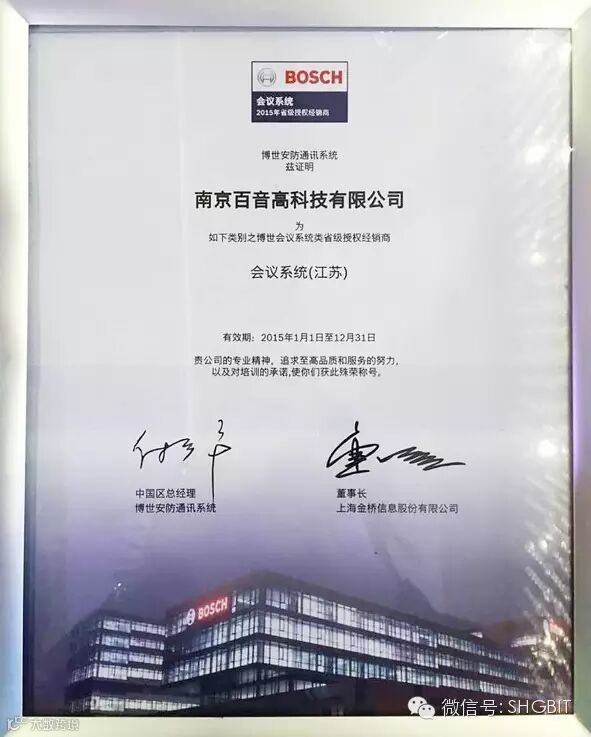 上海金桥信息股份有限公司成为博世会议系统华东与华西区的独家总代理商后,迅速与博世重新部署与优化销售渠道及开拓中国市场;继向武汉昌龙、郑州丽声、昆明泰伦、重庆富淞、江西益泰、南京艾利丰发放授权代理证书之后,不到一个月,金桥信息又成功推进了江苏地区销售渠道布局,与南京百音高科技有限公司联手合作,并正式向其发放授权代理证书,共同开拓江苏会议系统市场。