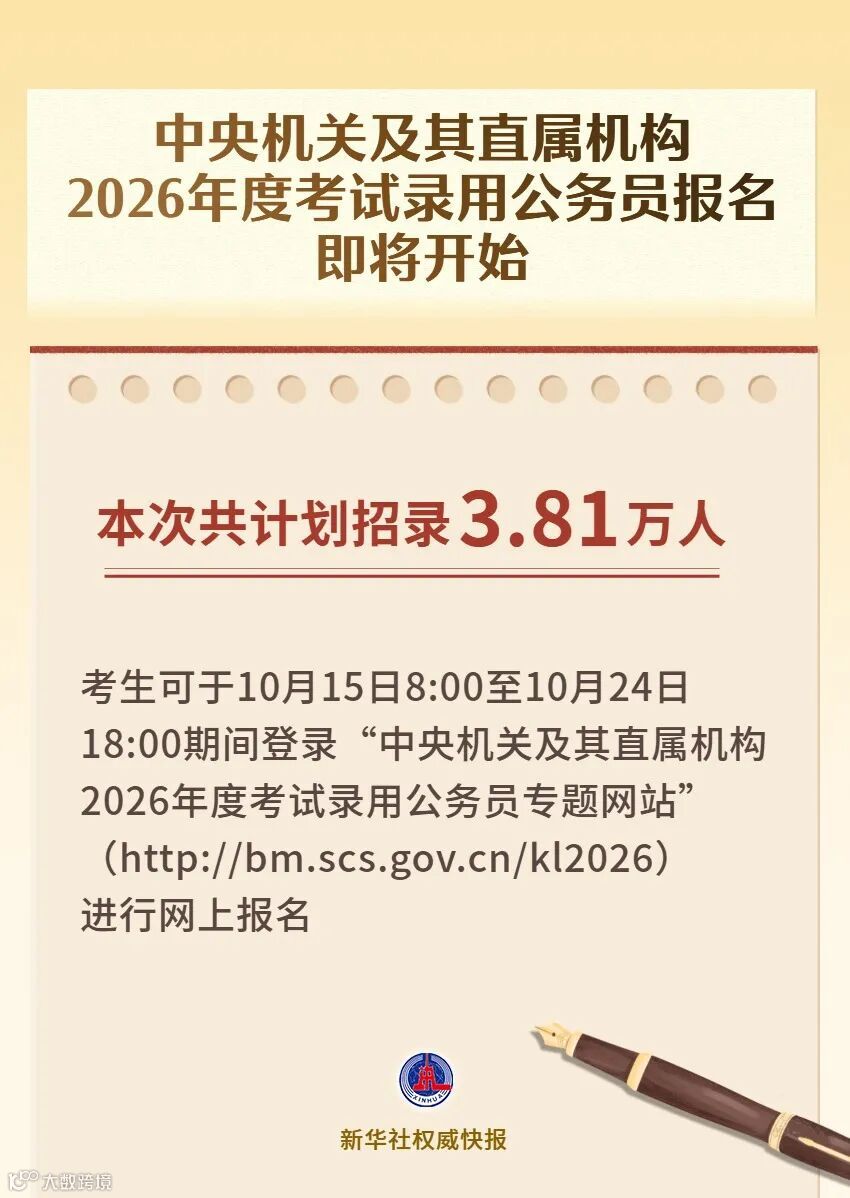 记者14日从国家公务员局获悉,中央机关及其直属机构2026年度考试录用公务员报名即将开始,共计划招录3.81万人。考生可于10月15日8:00至10月24日18:00期间登录“中央机关及其直属机构2026年度考试录用公务员专题网站”(http://bm.scs.gov.cn/kl2026)进行网上报名,公共科目笔试将于11月30日在全国各直辖市、省会城市、自治区首府和部分城市同时举行。
