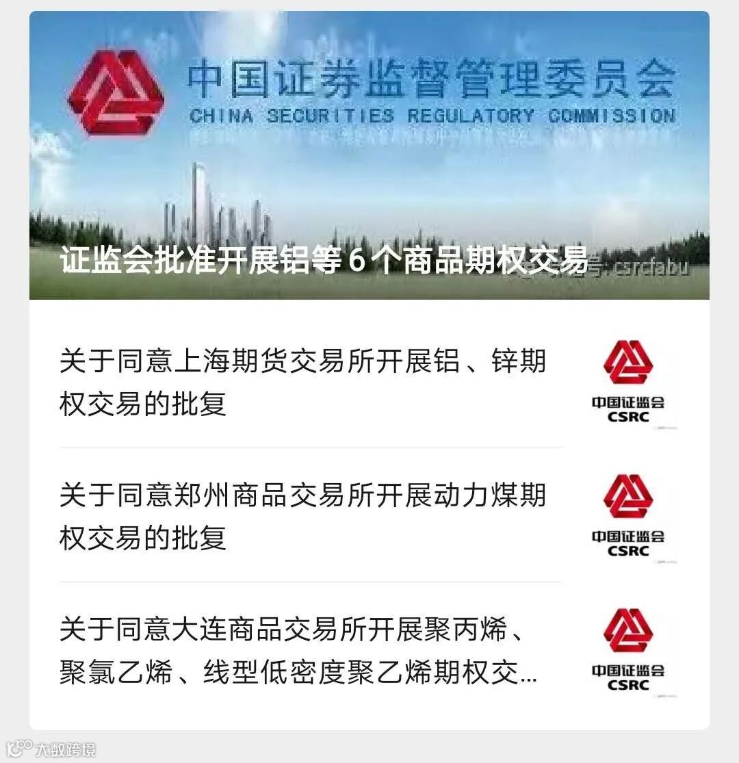 证监会已于近日批准上海期货交易所开展铝、锌期权交易,批准郑州商品交易所开展动力煤期权交易,批准大连商品交易所开展聚丙烯、聚氯乙烯、线型低密度聚乙烯期权交易。动力煤期权合约正式挂牌交易时间为2020年6月30日,聚丙烯、聚氯乙烯、线型低密度聚乙烯期权合约正式挂牌交易时间为2020年7月6日,铝、锌期权合约正式挂牌交易时间为2020年8月10日。