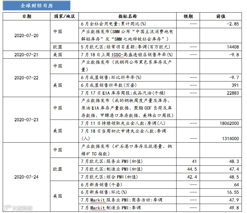 1. 7月20日(周一):产业数据发布(SMM公布“中国主流消费地电解铝库存”及“SMM七地锌锭社会库存”)、7月LPR报价、中国6月全社会用电量