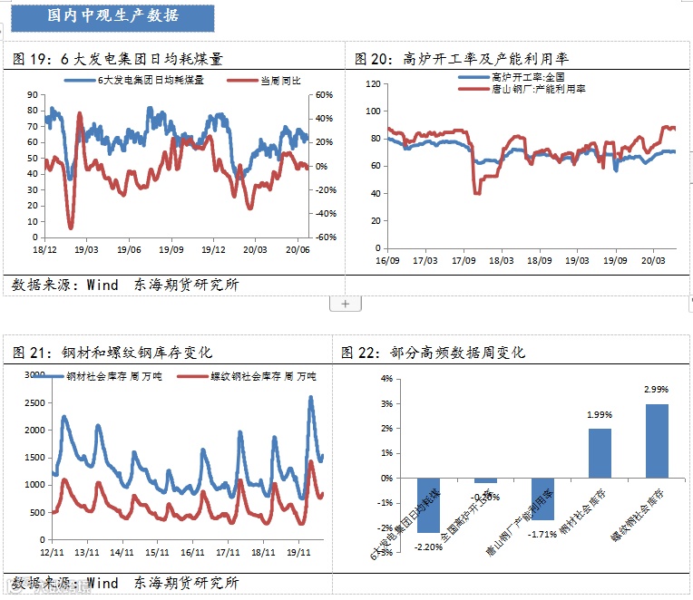 二季度GDP增速转正,6月份生产和需求延续回暖,但供给端修复速率放缓,需求端复苏出现分化。地产基建投资较强,消费改善偏弱。目前需求端恢复遭遇瓶颈,居民消费受制于可支配收入下降,及疫情出现反复或持续受到抑制,关注国内政策逐步出台能否刺激内需回暖。房地产投资受益于土地购置费的增加恢复较快,基建投资受益于政策推动加速落地。经济“V”型反弹最快的阶段已过,房建基建集中赶工期或告一段落。需关注梅雨季及洪涝灾害对南方建筑业景气的影响,或对建筑链条造成扰动,从而抑制大宗商品价格。