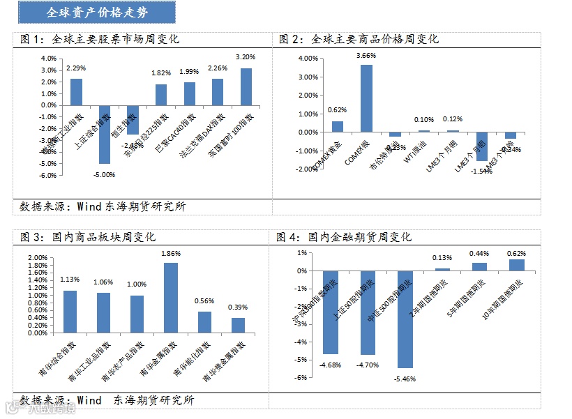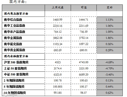 上周国内商品板块全面上涨,股指期货大幅回调,国债期货全面走高。