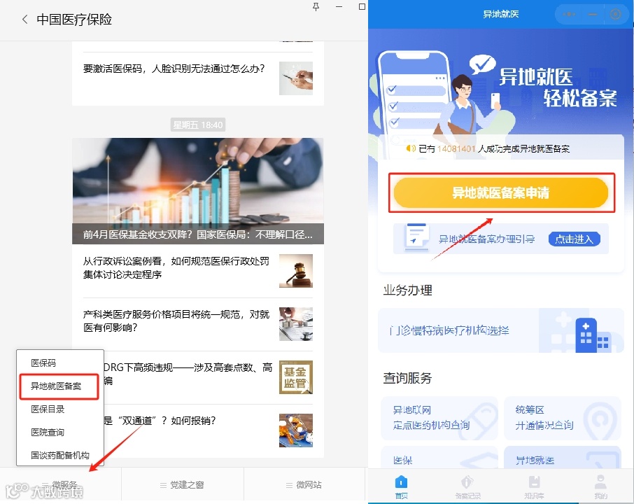 进入“中国医疗保险”微信公众号,点击微服务→异地就医备案,进入异地备案小程序页面。点击“异地就医备案申请”按钮,开始备案。