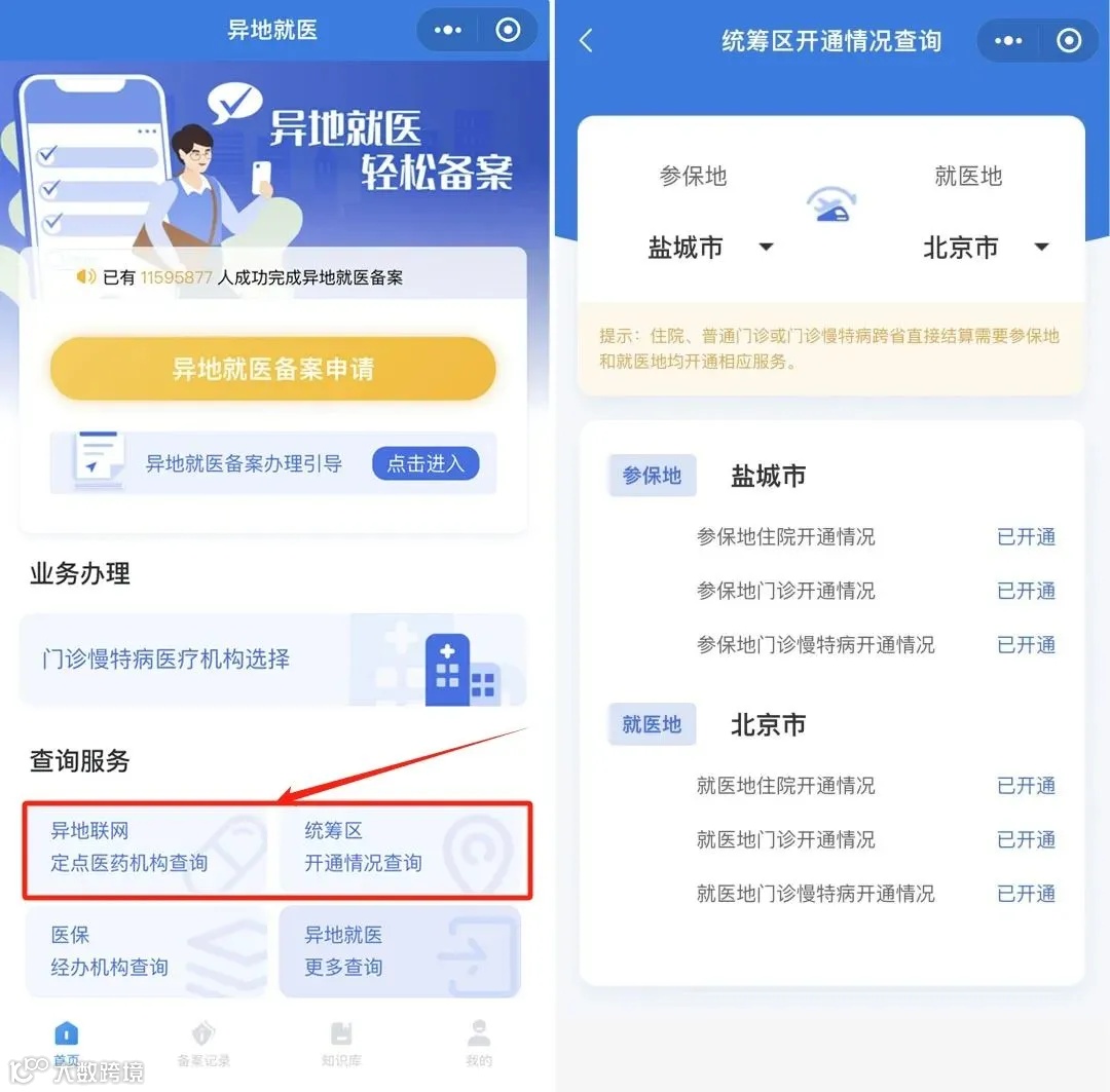 除了申请备案外,参保人还可以在小程序查询各统筹区及异地联网定点医药机构的开通情况。