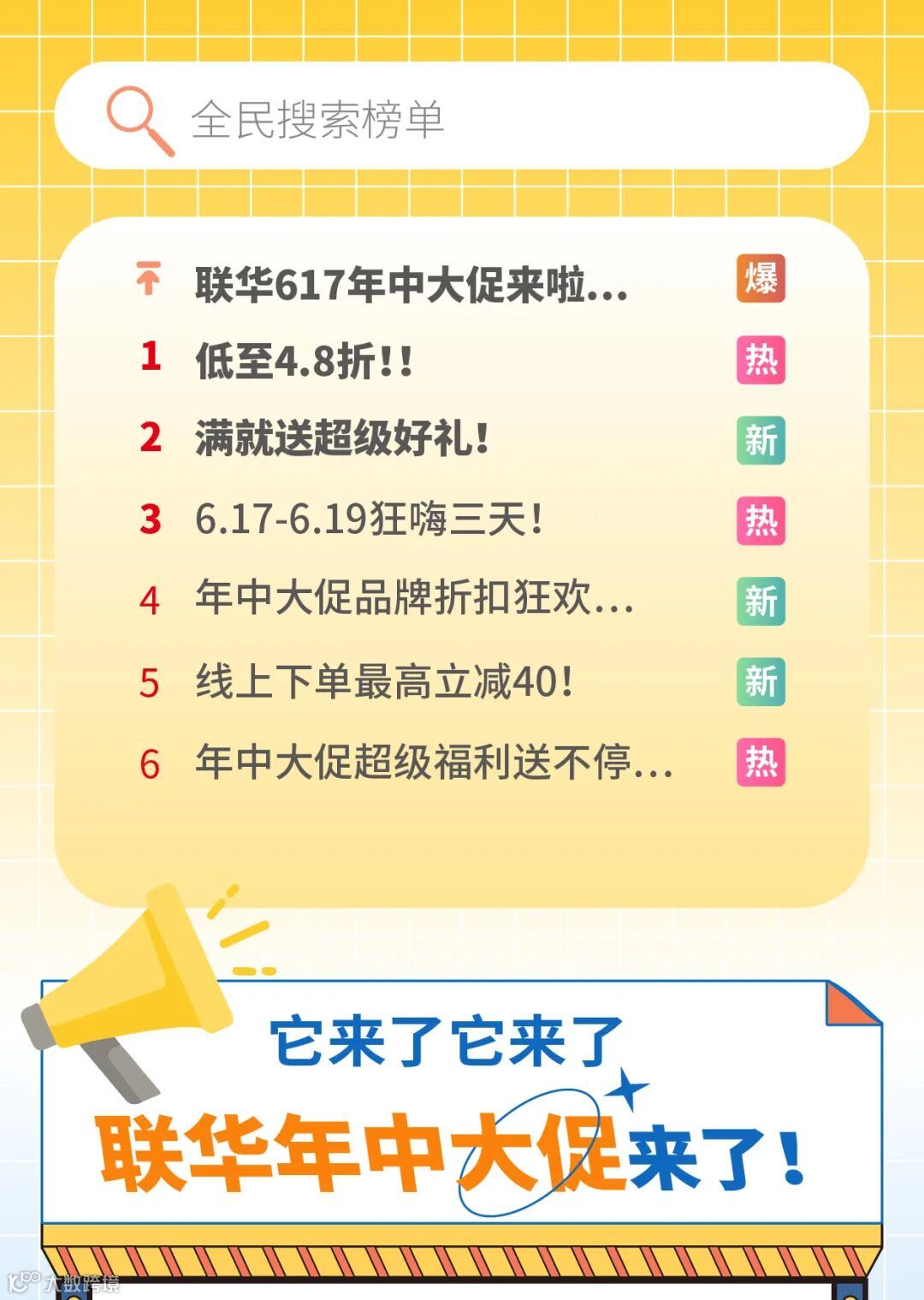 热搜榜TOP->联华617年中大促来啦!超大折扣!超嗨爆款!超级满减!全都有!【分享集赞有好礼】