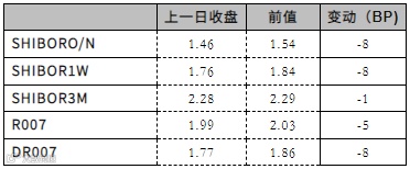 5月18日,国债期货收盘涨跌不一,30年期主力合约涨0.01%,10年期主力合约收平,5年期主力合约涨0.01%,2年期主力合约跌0.01%。资金面宽松,Shibor短端品种多数下行。隔夜品种下行7.7bp报1.463%,7天期下行8.4bp报1.76%,14天期上行7.8bp报1.948%,1个月期下行2.4bp报2.136%。