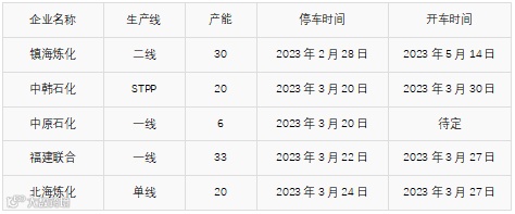 装置方面:贵州金赤年产30万吨煤制甲醇装置因成本问题于2022年8月22日停车,于2023年3月25日重启,目前已产出精醇,陆续提负中。山东金能化工年产10万吨甲醇装置于3.21附近故障停车,目前已恢复正常。山西焦化年产26万吨焦炉气制甲醇装置3月26日计划性停车检修其中一套装置,暂定于4月10日恢复。