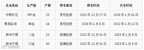 装置方面:江油万利年产15万吨天然气制甲醇项目于12月初因限气停车,预计春节后开;山西晋煤天源年产10万吨甲醇装置因疫情影响于11月24日停车,目前于12月28日重启;山西晋丰闻喜年产5万吨小装置目前运行平稳;高平年产10万吨甲醇装置1月2日停车;云南云天化年产26万吨甲醇装置因成本问题于1月1日停车,预计为期2个月以上。新疆新业年产50万吨甲醇装置目前临时检修,维持在半负荷运行状态,预计为期十天。