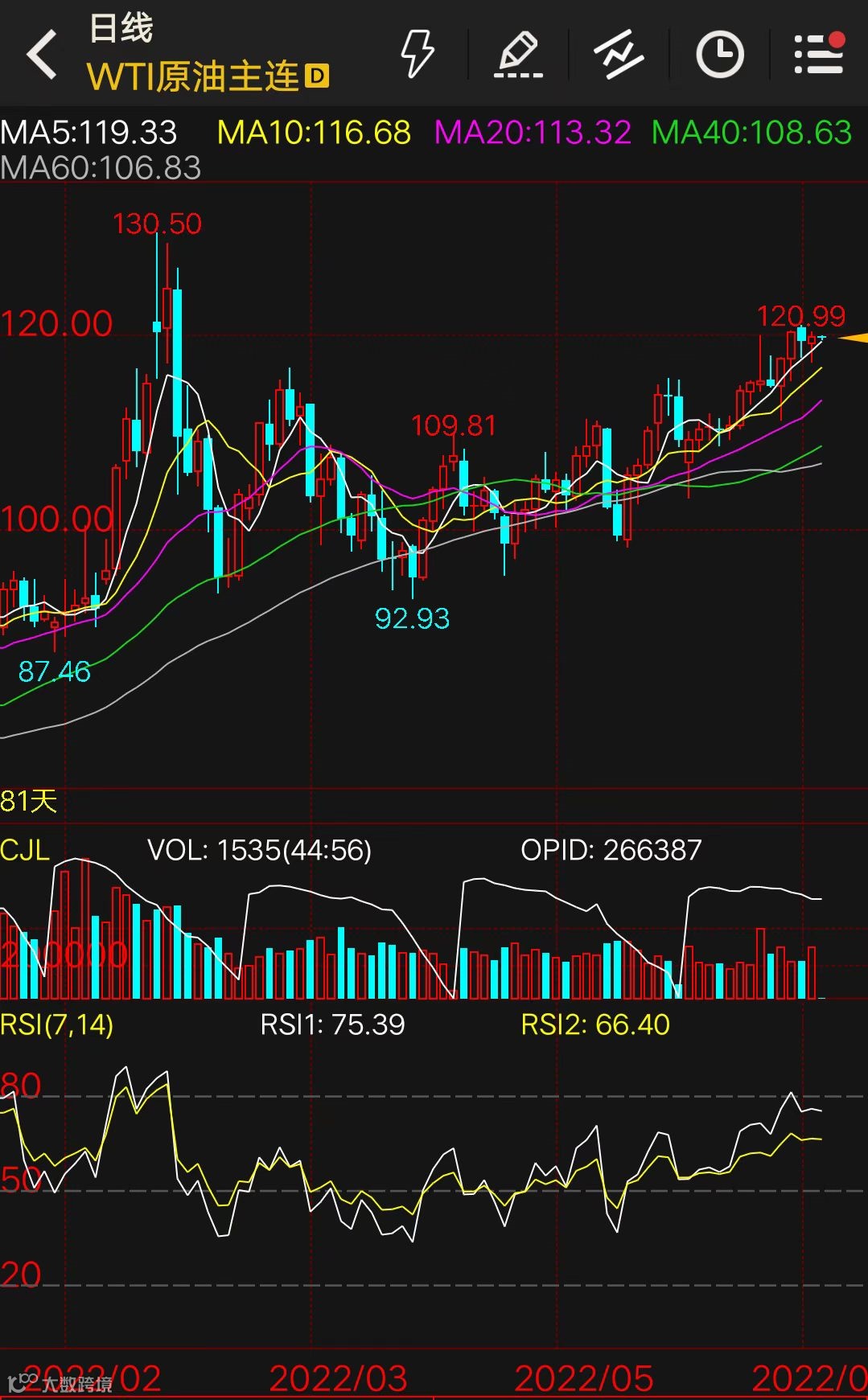 近日,原油价格保持振荡上行趋势,内盘原油一度大幅回调,但最终收涨并向上突破。截至周二收盘,WTI原油期货7月合约收于119.41美元/桶,涨幅为0.77%;布伦特原油期货8月合约收于120.57美元/桶,涨幅为0.89%。
