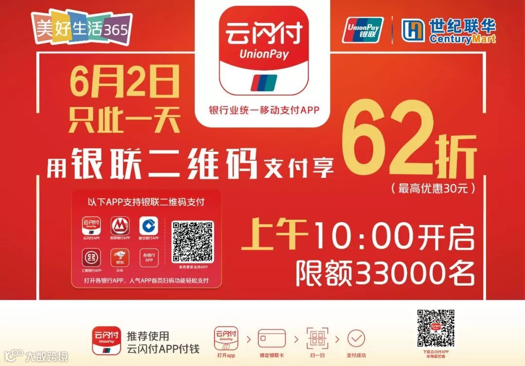 1、使用银联二维码支付,可享受6.2折(最高优惠30元)活动期间限量3.3万份,先到先得,满额为止。