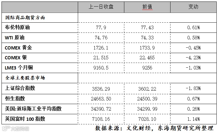 市场情况:Brent主力收于74.7美元/桶,前收74.76美元/桶,WTI主力收于74.33美元/桶,前收75.42美元/桶。Oman主力收于75.87美元/桶,前收76.23美元/桶,SC主力收于489.2元/桶,前收492.2元/桶。