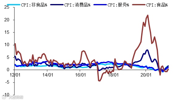 图2 CPI食品、非食品、消费、服务当月同比