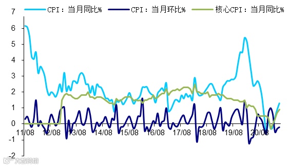 中国5月CPI同比上涨1.3%,预期涨1.6%,前值涨0.9%;
