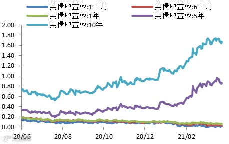 在海外方面,在疫情、工资通胀、油价基数效应等作用下,美国通胀率或将在二季度创下年内高点并维持较高水平,压制美债收益率上行速率,目前美债收益率上行速率有所放缓。
