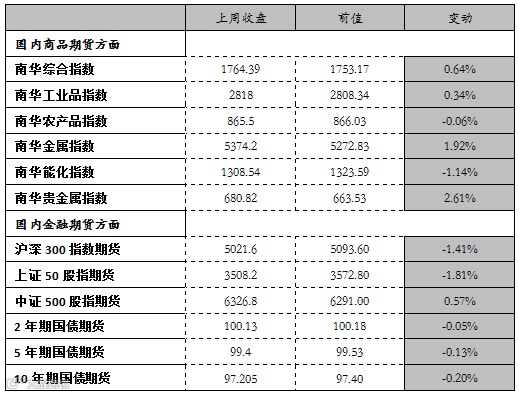 上周国内商品期货涨多跌少,股指期货涨跌互现,国债期货小幅下跌。