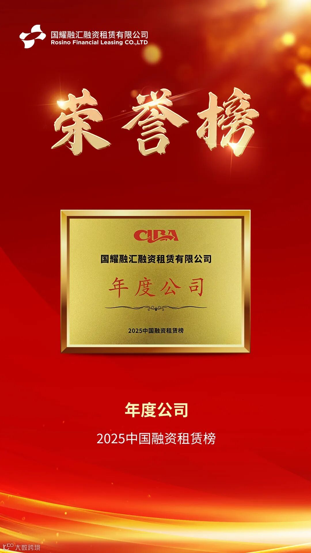 近日,2025中国融资租赁年会成功召开并发布“2025中国融资租赁榜”。经过业内专家、学者的一致审定,国耀融汇租赁凭借过去一年在服务实体经济的杰出表现、专业化运营能力及稳健的风险管理水平,获评“2025中国融资租赁年度公司”。