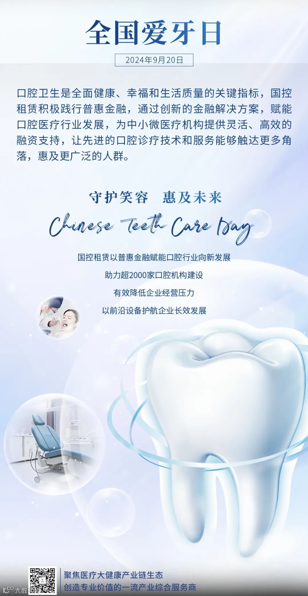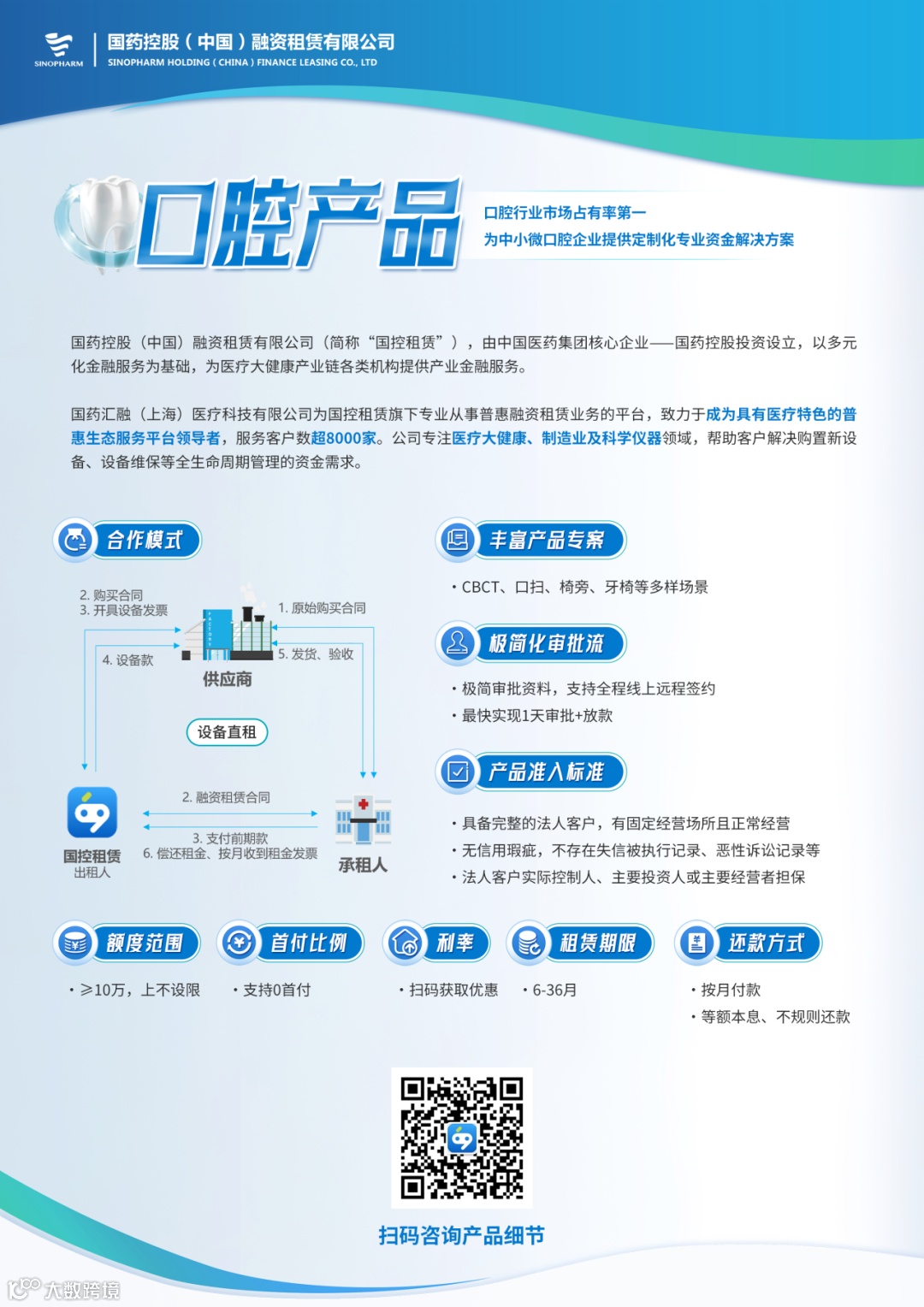 国控租赁普惠口腔产品,致力于为中小微口腔企业提供定制化专业资金解决方案,针对CBCT、口扫、椅旁、牙椅等多样场景,通过设备直租形式一站解决企业设备采购需求。