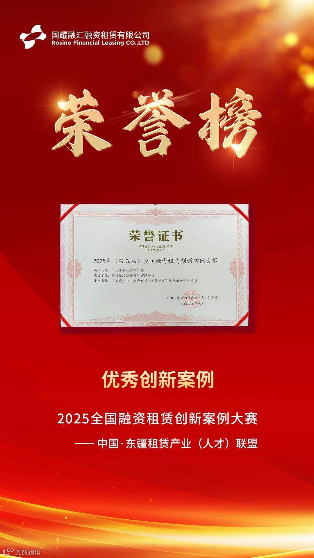 近日,由天津市滨海新区总工会、中国东疆租赁产业(人才)联盟主办的2025年(第五届)全国融资租赁创新案例大赛颁奖活动在天津成功举办。国耀融汇租赁“医疗产业+融资租赁+能源管理”绿色低碳示范项目荣获“优秀创新案例”奖。